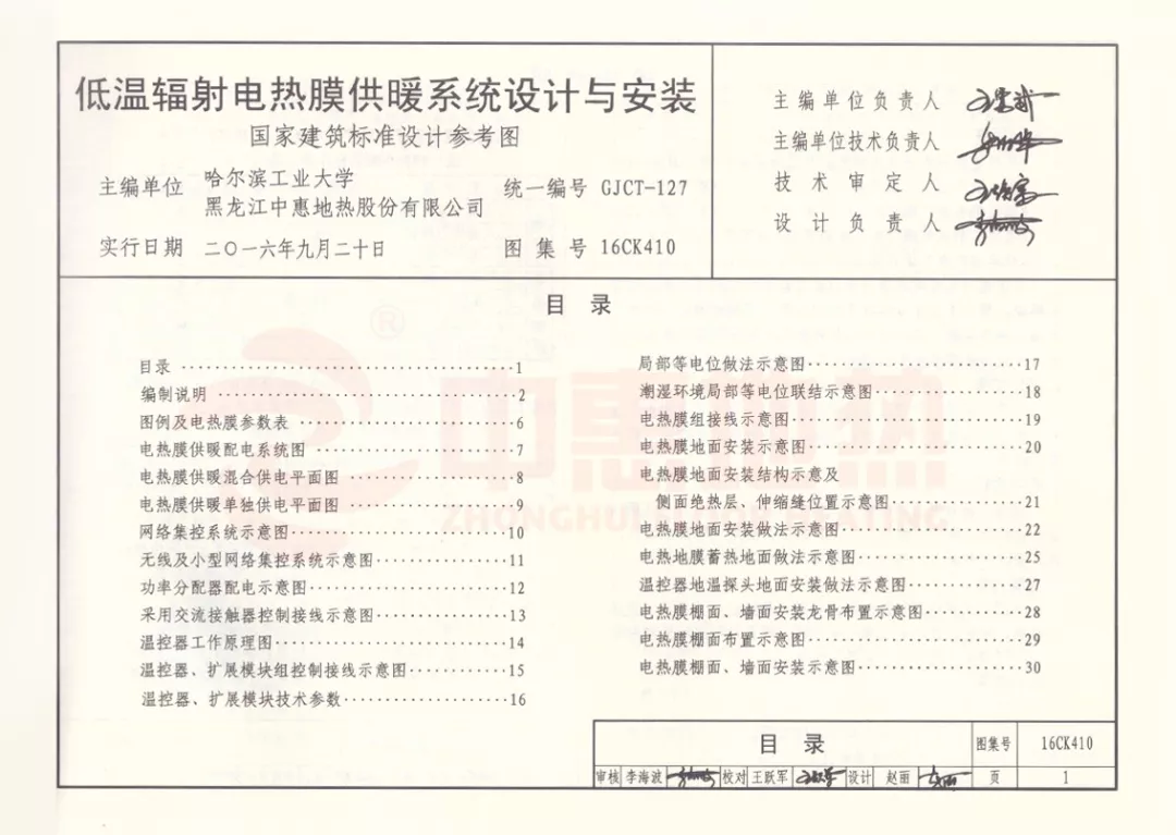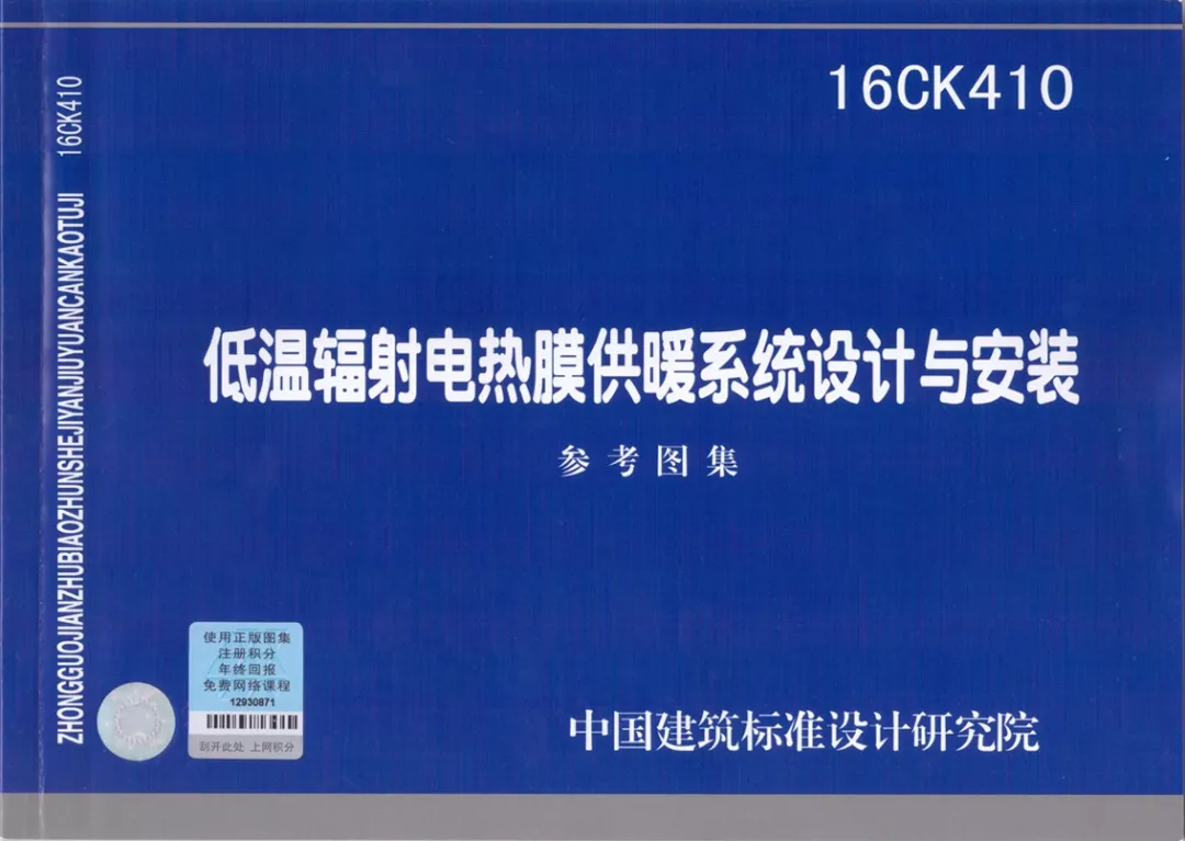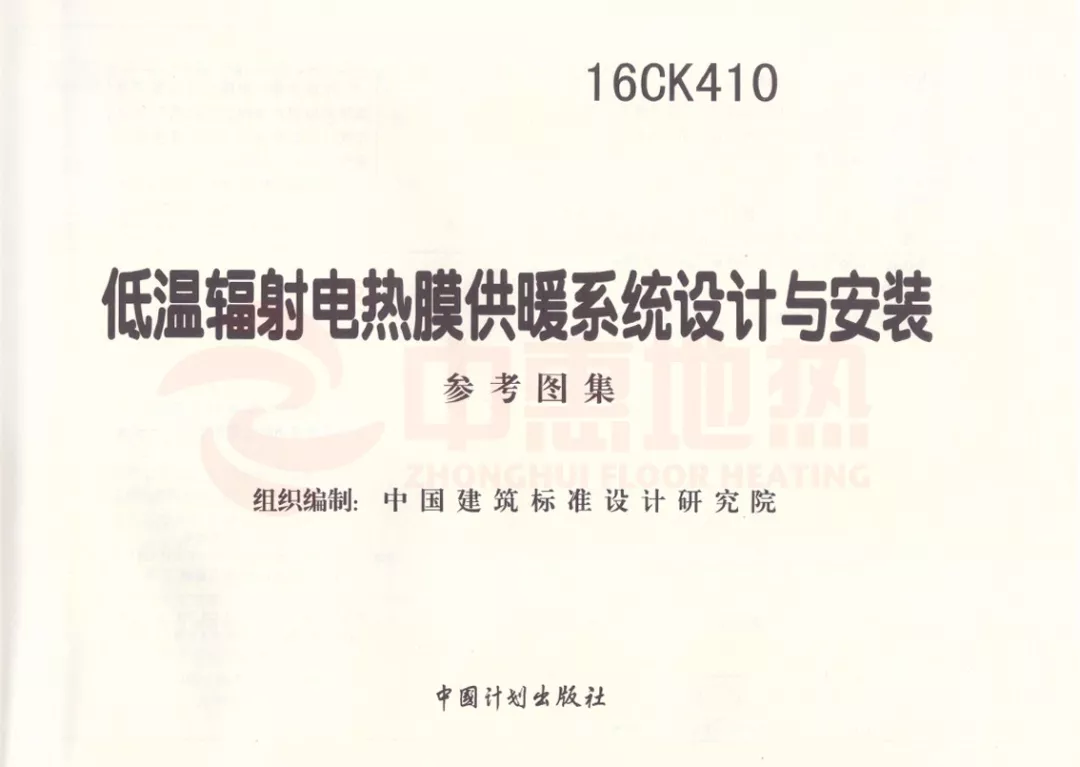 中国建筑标准设计研究院颁布实施的16CK410《低温辐射电热膜供暖系统设计与安装》国家建筑标准设计参考图集是在建设部的批准下,由哈尔滨工业大学联合黑龙江中惠地热股份有限公司共同编制的。