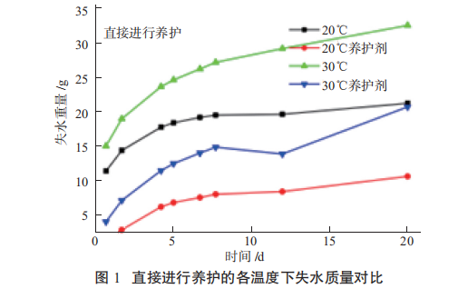 1.2.1 养护剂对保水性能的影响 参照 JC 901- 2002《水泥混凝土养护剂》标准,分别将拌和好的混凝土放到底部被胶带密封的150 mm×150 mm×150 mm 的模子中。空白样表面用抹刀抹平,涂抹养护剂的试样在上表面周围开深3 mm、宽不到 3 mm 的 v 行槽,用蜡封好后,表面抹平。待当刷不出来或用手指轻擦过无水迹时,对空白样立即进行称重,记录称量时间和质量,随后放入常温环境(20 ℃),对涂养护剂的试件先称重,后涂抹 6 g 左右养护剂,记录称重,记录准确的养护剂涂抹量,之后也置于常温环境(20 ℃),间隔一段时间对其质量进行称重(每组试件共 8 个,即 4 个空白试验,4 个涂刷养护剂试验)。放入高温(30 ℃)环境步骤同上。