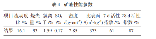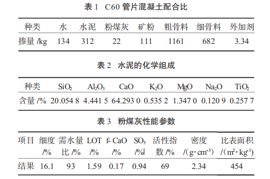 1.1 混凝土配合比 本试验采用 C60 配合比,配料表见表 1;PII52.5 水泥、粉煤灰、矿粉作为胶凝材料,其性能参数见表 2~ 表 4;粗骨料选用 5~25 mm 连续粒径石灰石、细骨料选用细度模数为 2.7 的河砂,减水剂为聚羧酸减水剂,养护剂为乳液状高分子养护剂。