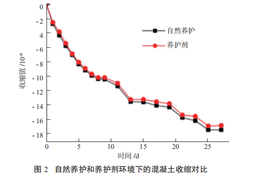 2.3 养护剂对混凝土收缩性能的影响 混凝土在水化过程中会产生收缩变形,应力约束下混凝土收缩可致混凝土产生裂纹病害[8]。对比混凝土试件在自然养护和养护剂养护条件下的收缩变形(见图 2),可以看出随着龄期的延长,混凝土试件会不断产生收缩变形,基本在 28 d 保持稳定,并且与自然养护相比,养护剂养护混凝土试件的收缩变形较小,表明涂抹养护剂有利于控制混凝土的收缩变形。
