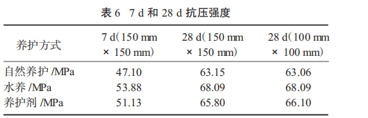抗压强度测试结果见表 6。在养护剂养护条件下,7 d 和 28 d 混凝土试件强度可达到 51.13 MPa和 65.80 MPa,均高于自然养护条件下的试块抗压强度,但是小于水养中的抗压强度。不同养护条件下的抗压强度和劈拉强度的规律一致,养护剂养护条件下,抗压强度介于自然养护和水养之间。表明与自然养护相比,无论是早期还是后期,养护剂对抗压强度均有一定的促进作用。