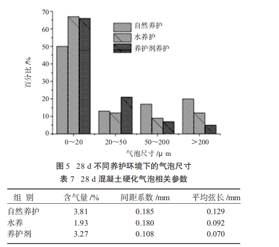 2.5 养护剂对混凝土硬化气泡参数的影响 混凝土内部的空隙结构会对其抗压强度及抗渗性能等指标产生影响。28 d 不同养护环境下的气泡尺寸见图 5。28 d 自然养护下 4 个气泡尺寸范围的比例分别为 50%、13%、17%、20%,水养 4 个等级所占比例为 67%、12%、9%、12%,养护剂养护 4 个等级所占比例为 66%、21%、7%、5%。由此可知,相比自然条件养护,养护剂养护优化了混凝土气泡比例,降低了有害的大尺寸气泡比例。一般认为含气量越高,强度越低。间距系数越小,弦长越小,说明气泡尺寸越小,气泡越稳定。28 d 混凝土感化气泡相关参数见表 7。由表 7 可知,涂刷养护剂养护相对于自然养护的气泡的平均弦长和间距系数变小了,说明与自然养护条件相比,涂养护剂养护有利于小尺寸的气泡的形成,优化了混凝土内部空隙结构。