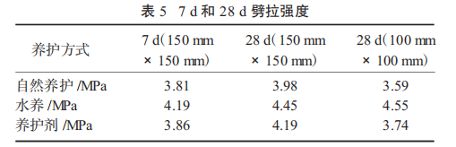 2.2 力学性能 劈拉强度测试结果见表 5。从 7d 和 28d 的劈拉强度来看,涂抹养护剂的劈拉强度可分别达到 3.86MPa 和 4.19 MPa,均高于自然养护条件下的试块劈拉强度,但是小于水养中的劈拉强度。表明与自然养护相比,养护剂养护对混凝土劈拉强度增加有一定的促进作用。