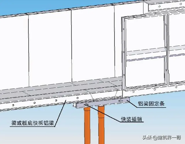 2、铝合金快装拆模板体系由楼板模板、梁底模、梁侧模、梁板顶撑、梁板支撑梁、阴角模、连接紧固销、钢支撑等构件组成。这些构件均由铝合金型材或型钢焊接而成,焊接质量好,强度高,外观形象好。