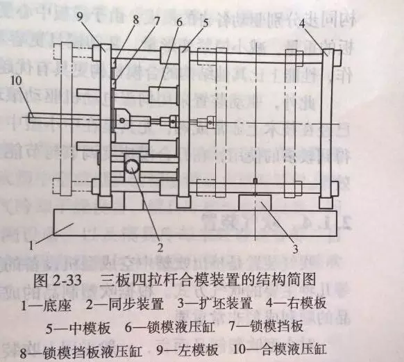 三板双拉杆合模机构是目前在用的大中型吹塑设备中使用最多的一种合模机构,大多200L全塑桶吹塑设备的合模机构采用这种结构形式。在高压锁模装置上不同厂家采用了不同的结构形式,有采用增压液压缸的,有采用销锁液压缸的,还有采用直压液压缸的。下图所示为双拉杆合模机构简图。