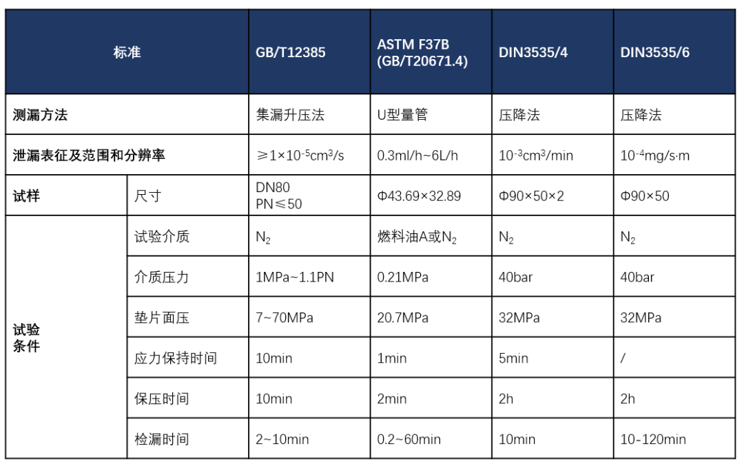 诚然,密封性能与垫片的材料及结构有关,还与材料的初始厚度、测试载荷、测试温度、测试时间密切相关,与测试的介质也紧密相关。以下就国内外常用的非金属垫片密封标准的测试条件和对比进行分析: