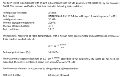 从GYLON® EPIX的TA-Luft的证书(TUV认证)可以看到测试条件和测试结果,GYLON® EPIX的泄漏率远远低于其容许的泄漏量1·10-4 mbar·l/(s·m)。