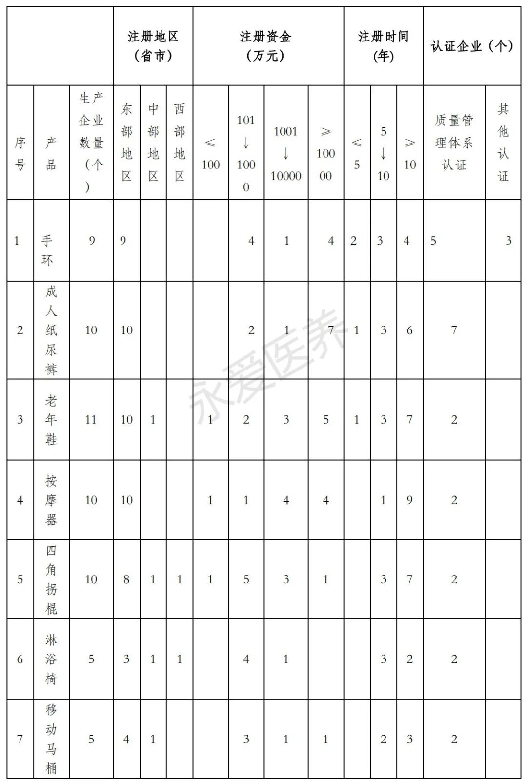 1)产品质量国家监督抽查计划中的老年用品2018 年以来,国家市场监督管理总局发布的各年度“产品质量国家监督抽查计划”所涉及的老年用品共有 7 种(每年 3-4 种),分布于“日用及纺织品”和“轻工产品”等类别之中。从总体上看,老年用品在产品质量国家监督抽查计划中的数量较少,但占比呈逐年上升趋势。(表 3.4,图 3.3)表 3.4 2018 年-2021年产品质量国家监督抽查计划涉及的老年用品种类及数量(种) 图 3.3 监督抽查计划老年用品数量占比 2)国家和部分地区涉及老年用品的产品质量监督抽查通报2018 年 1 月至 2021 年 8 月间,检索到国家和部分地区两级、两部门发布的涉及老年用品的产品质量监督抽查通报共 27 份;其中上海市发布的通报数量最多(9 份、占三成)。(表 3.5,图 3.4)表 3.5 涉及老年用品的质量监督抽查通报(份) 注:因检索方法、技术的局限性,存在相关信息收集不全之可能。图 3.4 涉及老年用品的质量监督抽查通报(份) 3)监督抽查通报指出的主要产品质量问题监督抽查通报中指出的老年用品主要的产品质量问题如表 3.6所示。表 3.6 老年用品主要产品质量问题 3、企业互动分析本项目调研了广东永爱医养产业有限公司等 18 家具有一定代表性的老年用品生产、销售企业(详见附件 4《调研企业名单》),与企业方面就老年用品的产品质量安全问题进行研讨。1)企业的产品质量安全管理状况受访企业大多重视老年用品质量安全问题,建立并实施了产品质量管理制度,18 家企业中多数通过 ISO 质量管理体系认证。尤其是一些具备医疗器械生产资质的企业在产品质量安全管理方面相对更加规范、完善。如河南翔宇医疗设备股份有限公司通过了 ISO9001 质量管理体系、ISO13485 医疗器械质量管理体系、ISO14001 环境管理体系、OHSAS18001 职业健康安全管理体系和 GB/T29490 知识产权管理体系 5 个管理体系的认证,并针对其 400 多种产品制定了企业标准。江苏鱼跃医疗设备股份有限公司通过产品失效分析、内部检测和质量管控等方法,主动发现、解决产品潜在的质量安全问题。(表 3.7)。广州龙之杰科技有限公司针对产品质量安全问题识别、处置等形成了完整的管理闭环流程(表 3.8)。表 3.7 鱼跃轮椅产品质量问题内部检测分析 表 3.8 广州龙之杰科技有限公司产品质量安全问题识别与处置 2)企业视角下老年用品的产品质量安全问题在受访企业中,涉及生产本项目所列“重点产品”的企业有 4 家,分别是杭州可靠护理用品有限股份公司(成人纸尿裤)、江苏鱼跃医疗设备股份有限公司和佛山市东方医疗设备厂有限公司(轮椅),以及宁波科强智能科技有限公司(智能手环)。从这些企业的角度看,相关的老年用品的产品质量安全问题主要是:(1)成人纸尿裤该产品与人体肌肤密切接触,如果发生产品质量问题,可能对使用者的身体健康产生伤害(某品牌企业公司招股说明书显示,报告期内存在两笔因过敏产生的医护补偿情形)。(2)轮椅车从市场客户投诉看,问题大多是在产品的易损件方面。如塑件、后轮、车架损坏,座背垫破损,电池亏电,锂电池保护,控制器报警等。(3)手环客户投诉主要集中在产品基本功能方面,如屏幕操作不流畅、电池续航时间短、定位不准、血压心率测量值不准、跌倒报警误报率高等。