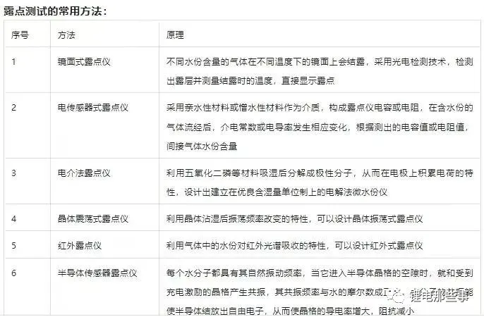 冷镜湿度计使用光学反射来检测反射面(镜面)上的冷凝温度。这些设备在实验室条件下非常精确,但在采样气体包含将进入溶液且在镜面上会发生冷凝的溶剂时,易受到称作拉乌尔 (Raoult) 效应的测量误差的影响。强酸或强碱也可能损坏镜面。氧化铝和氧化硅传感器可测量极低的露点温度,但也容易收到环境中酸碱的损坏和污染。聚合物传感器相对可耐受多种不同的化学污染物。所以目前在锂电池环境监测中以高分子薄膜等传感器作为露点监测的主要手段。而激光原理传感器则是未来的发展方向。
