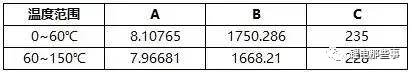 式中P单位mmHg(1Kpa=7.5mmHg),t单位℃,A、B、C为Antoine常数;不同温度下的Antoine常数: