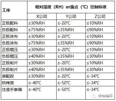 最后分享一下锂电池制造商对各制造工序的湿度控制标准,可以看出,各个厂商控制标准略有不同。总体的原则是湿度控制越低对锂电池性能发挥越好,但相应地会增加设备能耗,增加制造成本,因此需要根据实际情况进行湿度控制。