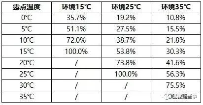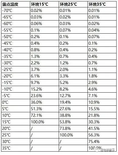 根据Antoine公式计算的不同温度下相对湿度和露点温度对照表如下: