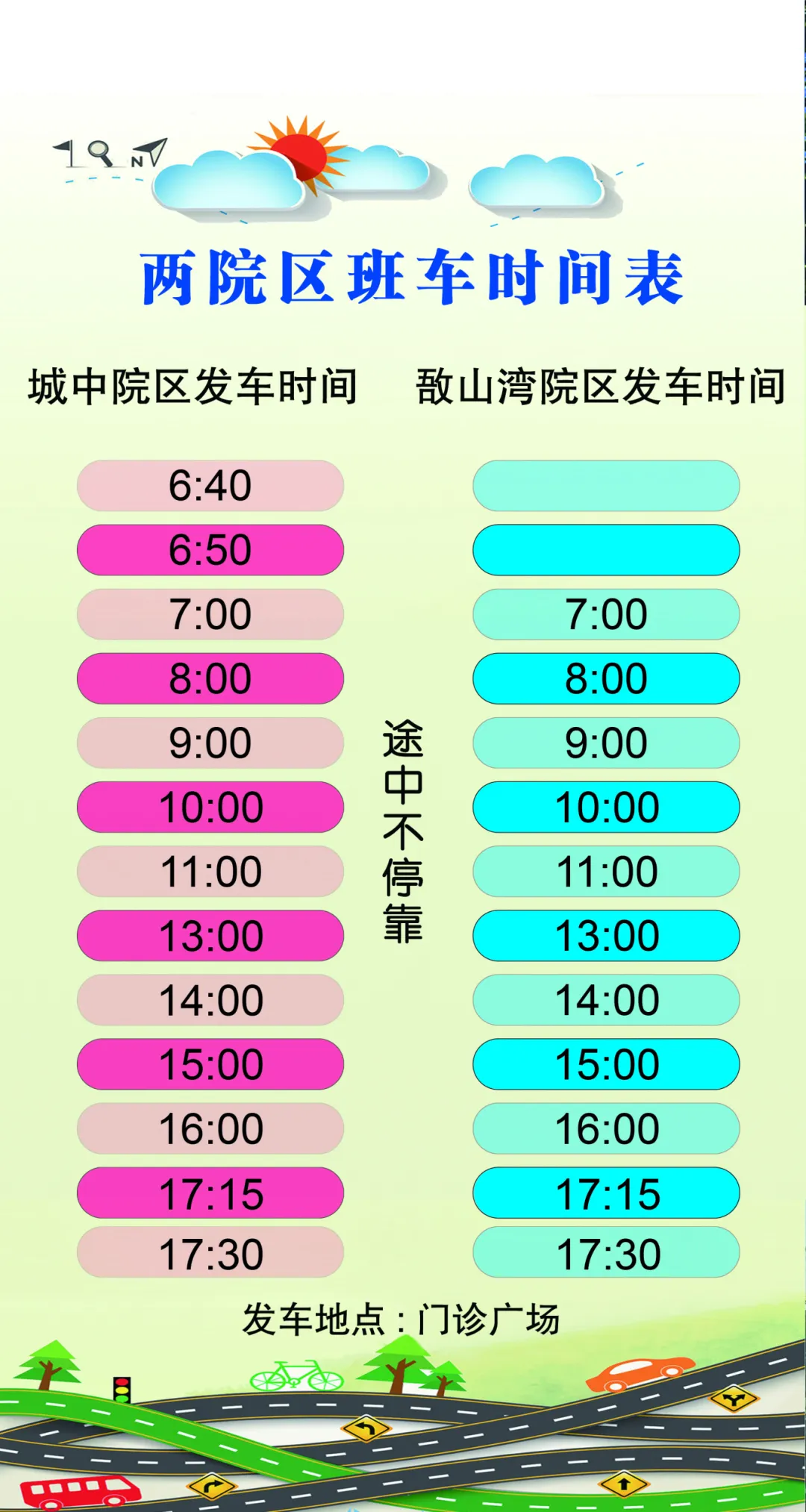乘坐提示1.医院班车全年运行,如遇影响车辆行驶安全的不可抗力因素,将根据交通安全规范暂停开行2.医院班车面向跨院区就诊患者和医院工作人员,免费乘坐3.医院班车运营车辆为公交车为保障乘客安全,请坐轮椅、患有相关疾病不宜长时间站立及其他存在乘坐公交车安全风险的人员自行选择其他合适的交通工具。