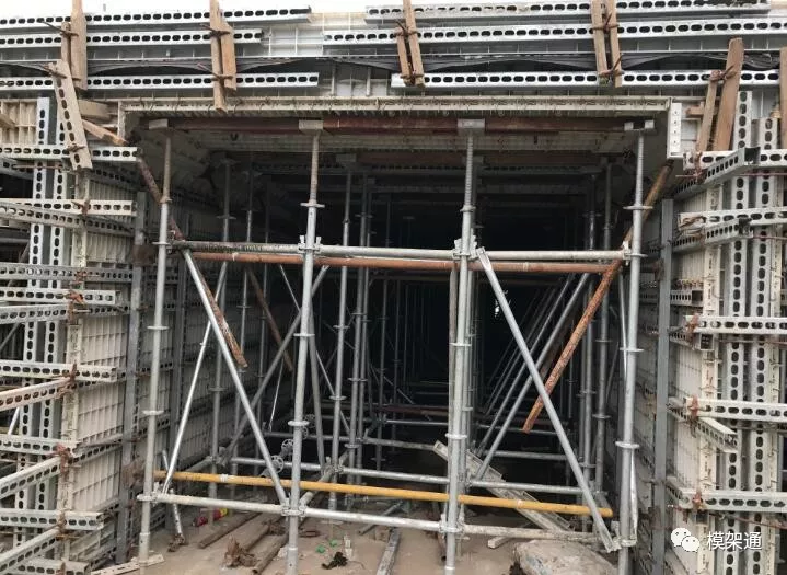 综合管廊的模板施工采用“由下而上”进行施工。工艺流程为:垫层模板→底板模板和侧墙模板→侧墙模安装→顶板模板→通风口、人孔井、投料口模板。 铝合金模板应用  铝合金模板施工程序 弹线→绑扎墙体钢筋→安装墙体模板→搭设顶板模架→调整标高→绑扎顶板钢筋→检查、验收→校正标高→检查验收→砼浇筑及养护→拆模→移动