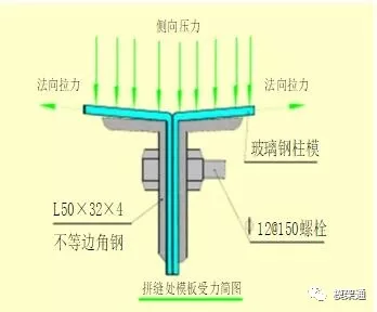 绘制圆柱玻璃钢模板的受力简图,验算角钢变形值,分析圆柱模板的受力特性,验算并确定角钢型号及螺栓间距。