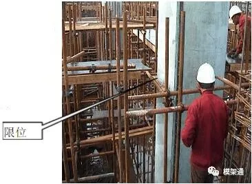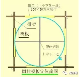 用木模做弧形限位,每根圆柱上、中、下各三道,弹出圆柱控制线,将限位固定在排架水平杆上,使弧线与圆柱边线在同一垂直立面上。