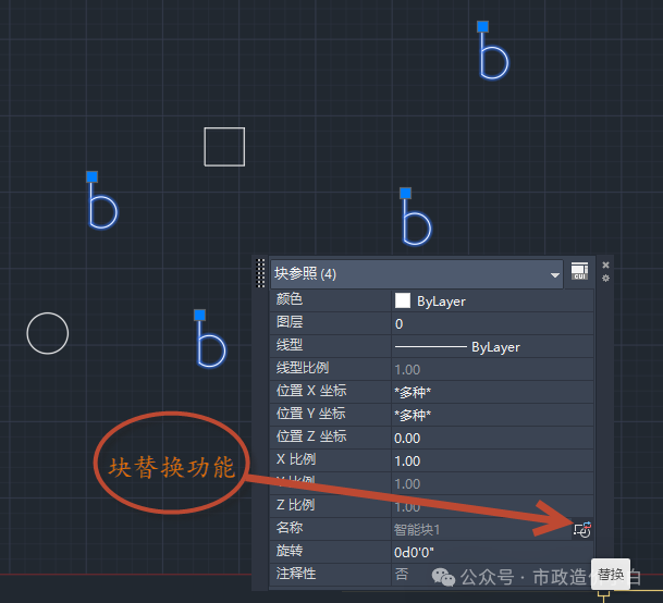 选择块后,在块名称属性中,有一个块的图标。以前需要用express才能完成的块替换现在可直接通过属性发来完成了。点图标后,选择新的块即可。可以一次全部替换,也可以只选择若干个替换。