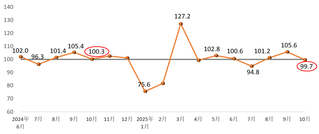 2025年10月,建筑材料工业景气指数为99.7点,低于临界点,处于非景气区间,比9月份回落5.9点,比上年同月低0.6点,建材行业运行趋缓。