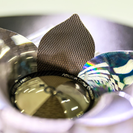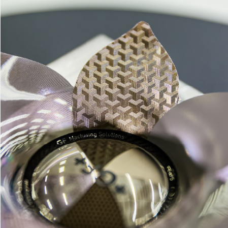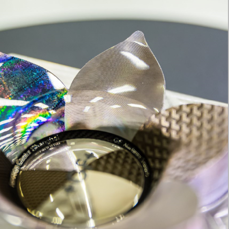 本次活动中最吸引眼球的还要属飞秒激光加工的各类应用展示件,这些应用示例包括汽车前大灯模仁及每个花瓣上都有不同纹理的莲花,每朵花瓣分别代表了不同的制造挑战,如各种各样的细微特征加工,彩光加工,激光喷砂加工等。更为别出心裁的是,每一瓣莲花的内圈和外圈分别使用了纳秒和飞秒激光加工,以便直观的呈现出两者加工效果差异。
