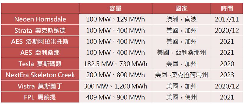 可再生能源为间歇性能源。没有光,太阳能就无法发电,风力发电在无风时也不能有作为,因此随着新能源装置量逐年增加,储能系统的重要性自然不在话下。目前世界上最大的是特斯拉在2017 年在南澳洲打造的100MW / 129MWh 电池厂,不过近年来也有许多公司开始投入大型储能厂,特斯拉南澳电池厂的冠军之位不保。对此,外媒GTM Media盘点出有关现在与未来的8大锂电池储能计划,其中特斯拉南澳电池厂虽然是第八名,但它是目前唯一建成的大型电池厂,对于当地供电稳定性也大有裨益。南澳电厂Neoen Hornsdale 在上工不到一个月就证明自己的价值,当远在1,000 公里外的维多利亚燃煤发电厂跳闸那瞬间,特斯拉电池就以140 毫秒的速度向电网输送了100 MW 电力,显示电池厂是个灵活性高与输电速度快的储能技术。第五到第七名的容量与发电量相同,都是100MW / 400MWh电池厂,其中两个计划与加州的能源转型有关,加州政府希望能用分散式能源将沿岸的天然气发电取而代之。美国南加州爱迪生电力公司(SCE)规划的Strata Oxnard 便是因为当地民众反对燃气发电影响沿海景致与空气品质,最后应运而生,预计Strata Oxnard 会在2020 年12 月并网;美国能源公司AES的电池厂AES Alamitos (洛斯阿拉米托斯)则会在2021 年上线,有助于汰换掉当地的天然气发电厂,负责提供锂电池的Fluence 表示,这将是第一个替代燃气电厂的独立电池储能系统。AES 在亚利桑那州也有规划储能系统,希望能用来补足太阳能的夜间用电。遥想当年,其实亚利桑早期发电体系主要以4 座火力发电厂、1 座核能为主,但在2011 年之后,亚利桑那州大力发展太阳能,如今形成庞大的太阳能聚落。但随着电池储能系统的需求愈来愈高,亚利桑那州公共服务公司(APS)在今年设下雄心勃勃目标,预计在2025 年打造容量共850MW 的电池储能系统,其中即将在2021 年并网的AES Arizona 就是计划的一部分。第四名的电池储能计划则位于加州蒙特里湾地区的莫斯码头,特斯拉与太平洋瓦电公司(PG&E)携手合作,打造182.5 MW / 730 MWh的电池储能厂,而且还会采用特斯拉新推出的大型电池产品“Megapack”。根据介绍,Megapack 可以一口气储存3MWh 电力,储电量是特斯拉另一储能系统Powerpack 的14 倍,预估容量超过1 GWh 的超级电池组能满足旧金山所有家庭6 小时用电需求。特斯拉表示,该电厂会在2020 年底并网,而且为了降低建设成本,电池厂也会建在原有的变电站附近。美国电力供应商NextEra Energy所属的计划排名第三,该公司打算在美国奥克拉荷马洲打造太阳能+风力发电+电池储能三合一发电园区,风能与太阳能的装置量皆为250MW,电池容量则高达200MW / 800MWh,风能建设进展最快,预计年底就会完工,电池厂则要到2023年才会上线。这可能是因为这类三合一的大型案厂较为少见,难以找到适合的风电和太阳能系统,除此之外,储能系统的成本和管理也是一部分原因,因此相较于其他发电厂,这项计划较难设计与推动。第二名则是PG&E规划的Vistra moss landing(莫斯码头),容量高达300MW / 1,200MWh,有助于降低对加州沿岸天然气厂的依赖。虽然说2017年到2018年的加州大火,让疏于线路维修的PG&E难辞其咎,并面临巨额的赔偿、濒临破产,但GTM认为这项计划会在破产前获得准许,预计能在明年底上线。第一名则是美国公用事业佛罗里达州电力与照明公司(FPL)推动,将在佛州马纳提县(Manatee County)打造大型太阳能厂与储能厂,储电容量是南澳储能厂的4倍之多,高达409MW / 990MWh、基本上跟一亿支智慧型手机差不多,可在两小时内为329,000户家庭提供电力,预估在2021年完工并网。FPL 认为,透过该技术,将能进一步减少对燃气电厂的依赖,大幅降低碳排放、燃料成本,并同时达到帮民众节省电费的效果。FPL 执行长Eric Silagy 表示,用一座大型太阳能电厂+新型电池厂取代一座上年纪的化石燃料厂,这可是世界首创的再生能源成就。 随着近年来锂离子电池成本逐年下降,电池储能系统将愈来愈炙手可热,彭博能源财经(BNEF)报告也指出,锂电池均化成本(LCOE)在2018 年前6 个月下降35%至每MWh187 美元,竞争力已愈来愈高,公用事业公司未来将拥有不同的调度电力好伙伴。虽然说锂电池也存有安全风险,5 月时美国亚利桑那州就发生2MW 锂电池储能系统起火爆炸意外,造成4 名消防人员轻重伤,目前相关企业公用事业Arizona Public Service(APS) 与电池供应商Fluence 也尚未明白事件始末,使得锂电池安全议题再度浮上台面,但这也有助更多科学家投入锂电池安全性研究,毕竟我们能在手机、笔电找到锂电池的身影,相关研究能使用者更安全。文章来源:科技新报 透过通威、大全、协鑫等财报看硅料市场的蛰伏期