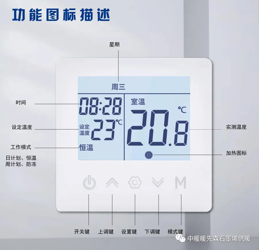 暖先森石墨烯地暖由温控器控制,只需简单设置即可畅享一冬天的温暖,温度调控随心所欲,老人小孩一教便会。