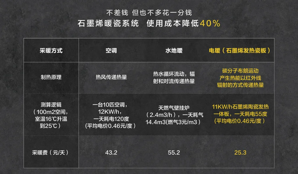 石墨烯高效的电-热转换率,模块化联网铺设,能够实现分区域供热,也大大减少了热量的额外浪费,减少电的损耗。智能恒温无需维护,比传统供暖节能约40%,绿色环保材料,省钱又省心。
