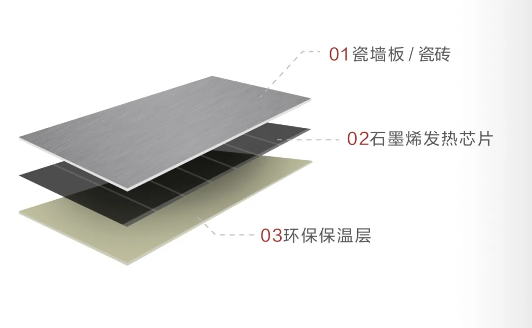 亚细亚石墨烯暖瓷系统,主要由3部分组成,分别是:瓷砖,石墨烯发热芯片,以及环保保温层。