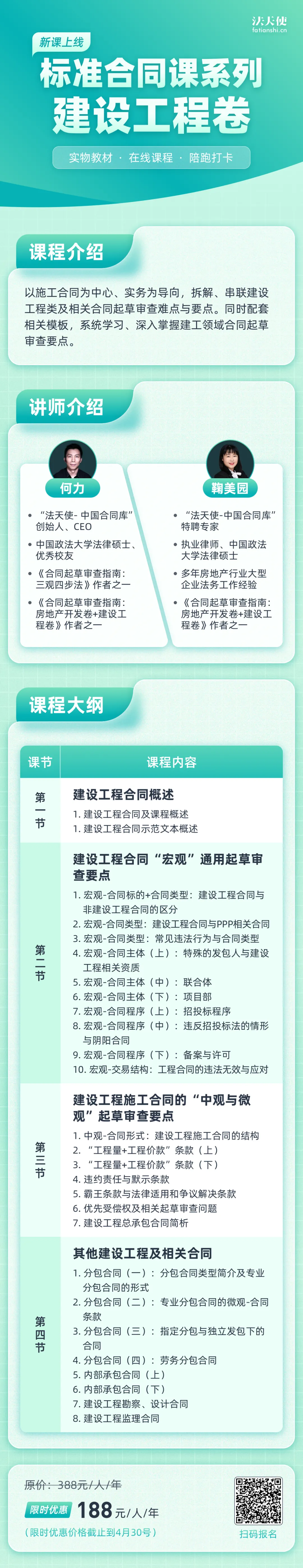 年初,法天使推出了《合同起草审查指南》系列之一的《合同起草审查指南:房地产开发卷、建设工程卷》书籍,终于,我们的配套课程也即将上线了。