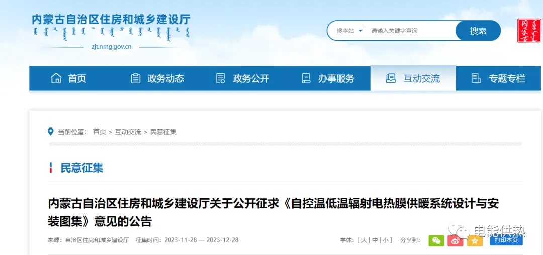 内蒙古自治区住房和城乡建设厅关于公开征求《自控温低温辐射电热膜供暖系统设计与安装图集》意见的公告