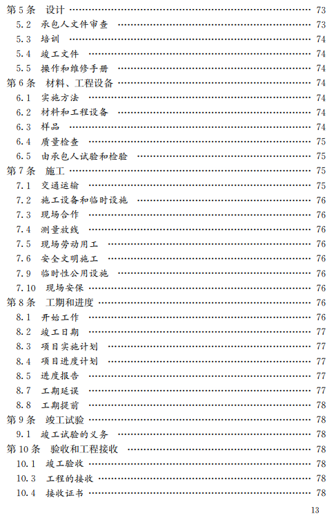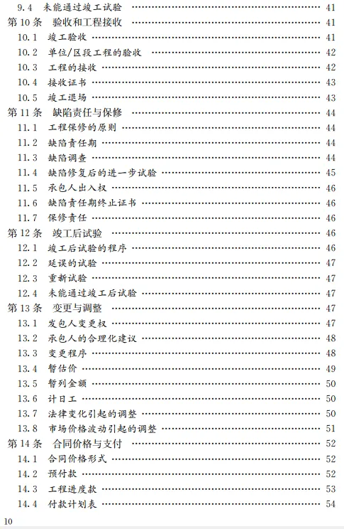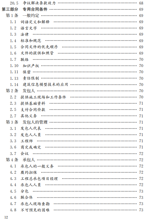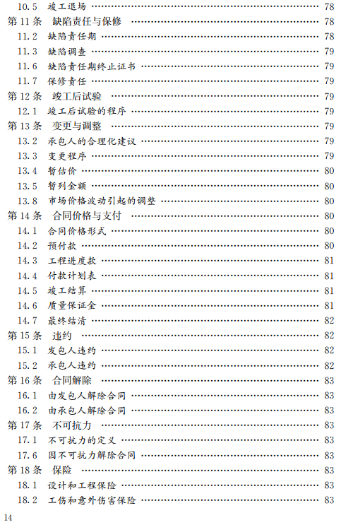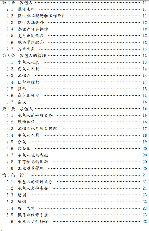 通用合同条件是合同当事人根据《中华人民共和国民法典》、《中华人民共和国建筑法》等法律法规的规定,就工程总承包项目的实施及相关事项,对合同当事人的权利义务作出的原则性约定。通用合同条件共计20条,具体条款分别为:第1条 一般约定,第2条 发包人,第3条 发包人的管理,第4条 承包人,第5条 设计,第6条 材料、工程设备,第7条 施工,第8条 工期和进度,第9条 竣工试验,第10条 验收和工程接收,第11条 缺陷责任与保修,第12条 竣工后试验,第13条 变更与调整,第14条 合同价格与支付,第15条 违约,第16条 合同解除,第17条 不可抗力,第18条 保险,第19条 索赔,第20条 争议解决。前述条款安排既考虑了现行法律法规对工程总承包活动的有关要求,也考虑了工程总承包项目管理的实际需要。