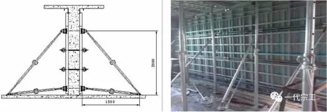 A14 墙模板斜撑:背楞采用内五道外六道设置,斜拉杆间距不大于2m,上下支撑;墙模安装完调整好标高、垂直度(斜向拉杆要受力);再进行梁底模和楼面板安装;
