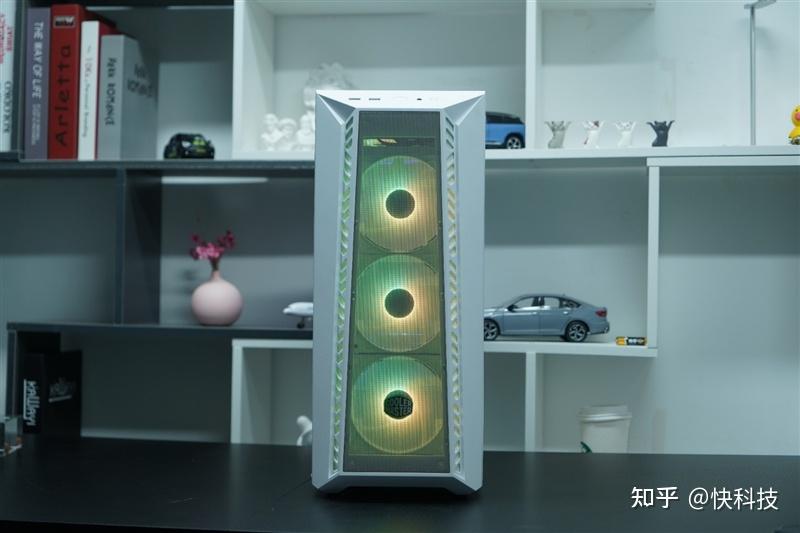 前面板内置了3个白色的120mm的ARGB风扇,可支持ARGB灯效,玩家可以使用主板的神光同步软件来自定义灯效。
