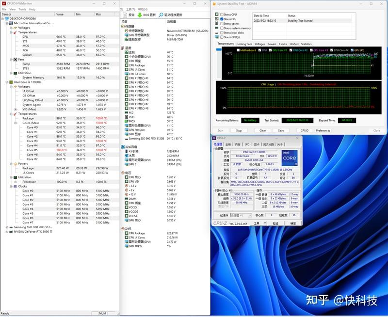 在BIOS中解除功耗限制,禁止AVX-512,使用AIDA64的FPU烤机测试,10分钟后,11900K的温度在91℃~98℃之间浮动,此时全核频率在5.1GHz,功耗在225W。