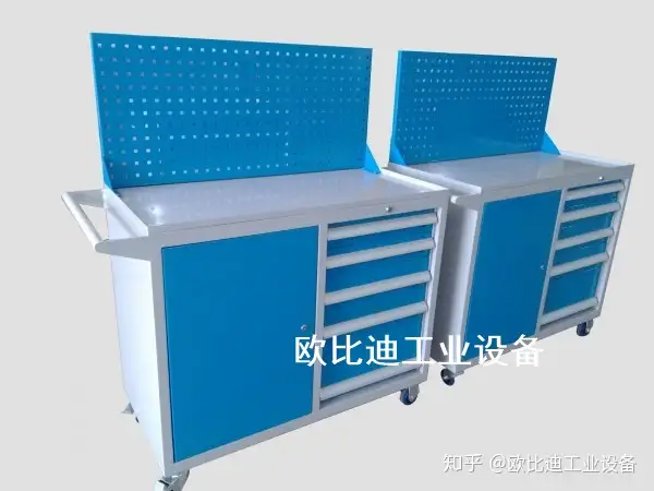 2. 台架为6个4抽屉重型工具柜组成,柜体与抽屉均采用1.2mm冷轧钢板制作,抽屉导轨采用2.5mm冷轧钢板折弯成型,单层抽屉载重可达80公斤。抽屉拉手采用全宽铝合金。抽屉内配置3*3活动分隔片;整体表面为静电喷粉烤漆处理。 3. 钳工台整体载重可达2000公斤。
