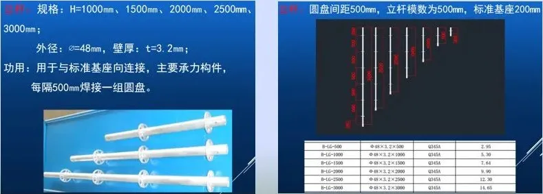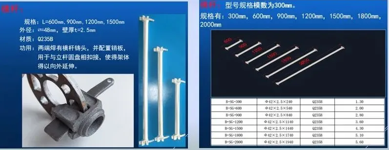 ,圆盘间距为500模数。根据楼层层高选择适的组合,8米以下的排架,其接头可以在同一个截面,但需要配相应的斜杆作为剪刀撑。注意:立杆上下不能颠倒,否则立杆上的圆盘与横杆上的接头和梢钉不相吻合,造成排架晃动不牢固。
