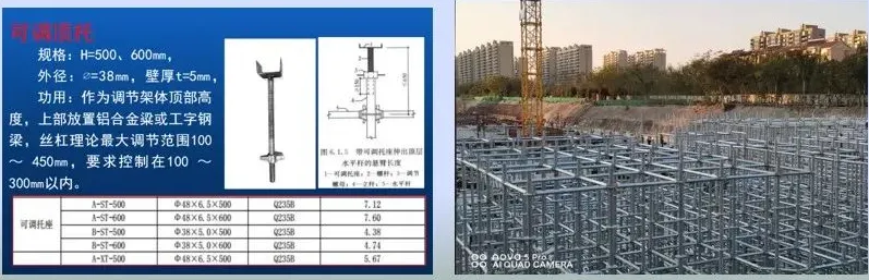 (5)顶托:常用600高,调节范围100-300。用来调节立杆高度,承受来自横向方管龙骨传递来的模板、钢筋、混凝土和施工荷载。
