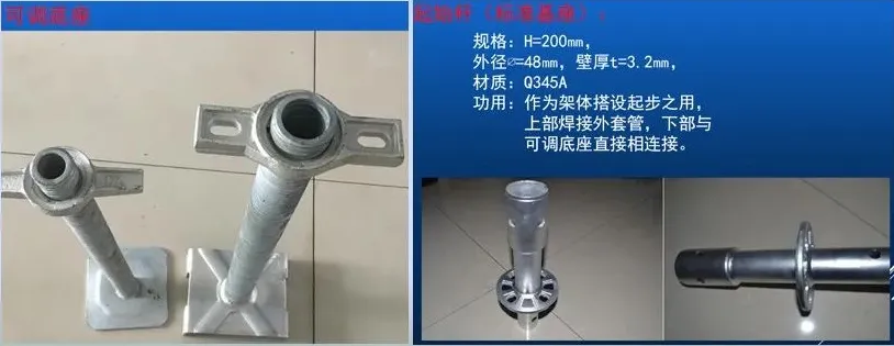 (1)可调式底座:为500高,可以先把排架底座按照施方案要求的立杆间距在基准面上排列,并调节到统的标高,便于向上的立杆及排架在统的水平面上,确保整体统一。