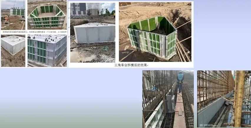 承台不另外配模,可以利用柱、梁的模板进行拼装。首先在施I现场平整的区域进行组装,每块板之间仅用梢钉连接即可。然后把承台的四个面用角铝组合在一