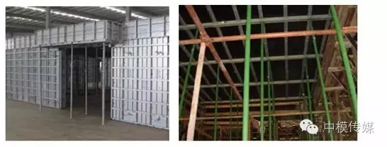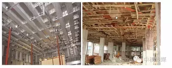 4、用一套铝模板、三套支撑代替三套模板、三套支撑的传统支撑方法,实施早拆模板施工技术,大大节省模板材料,增加模板周转次数,加快施工进度。铝模板和木模板现场支撑对比,如图6所示。