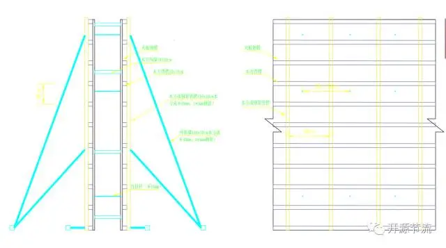 我们通常说所的木模板确切的应称之为“木模板体系”更为准确,它包含面板、背楞及相应的支撑、紧固体系,面板一般采用木夹板或者竹夹板,背楞、支撑体系一般采用木枋或者钢管,具体可见以下通用简图。