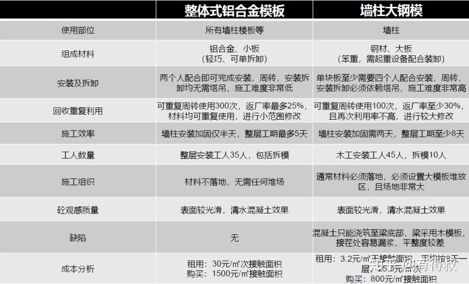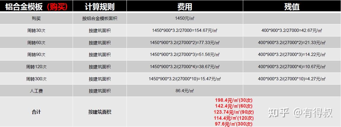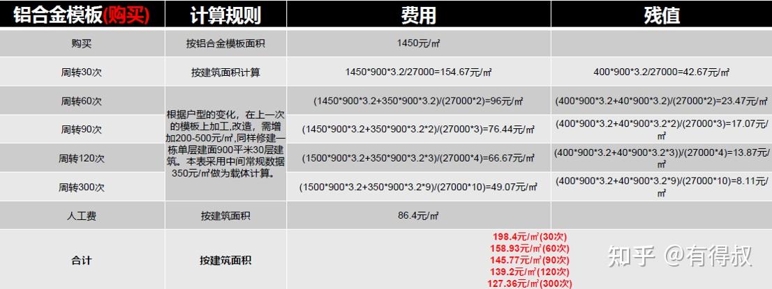 (1)铝合金模板如果购买,在单一项目周转使用50次,在成本方面能持平木模。