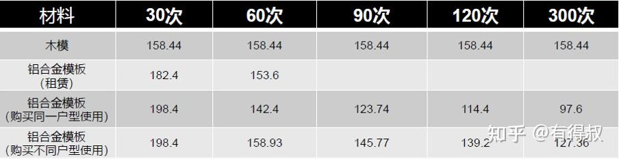 (2)如果购买铝合金模板持续周转,需返厂,则使用铝合金模板周转70次可与木模费用持平。(如铝模板质量达到免抹灰,30次可与木模板持平)