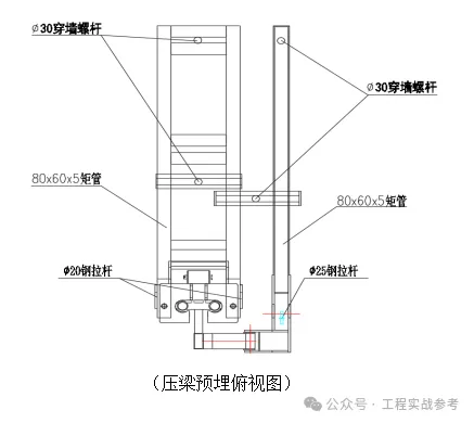 4.2.2预留孔:当外墙楼板面准备浇筑底板梁混凝土时,按照我公司提供的本项目的全钢附着式升降脚手架机位布置图预留相应安装孔,结构边梁处预留孔使用内孔35mm、壁厚大于2mm的PVC塑料管即可,管两端用宽胶布封住,以防止混凝土浇灌时进入管内而堵塞预埋孔;柱子处预留孔使用内孔35mm、壁厚大于2mm的钢管即可,管两端用宽胶布封住,以防止混凝土浇灌时进入管内而堵塞预埋孔。预埋大样如下所示:具体压梁预埋俯视图及压梁预埋侧立面图。