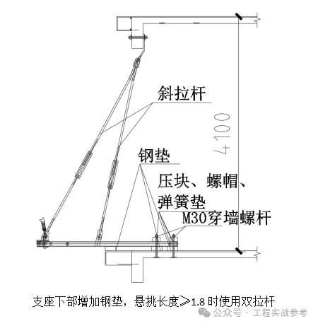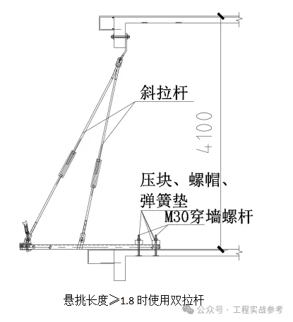 5)37层第二次搭设的附着式升降脚手架在建筑物四个大角处的附着:悬挑长度≥1.8时使用双拉杆,如下图所示,四大角处边支座与临近支座位置重叠时下部增加钢垫,悬挑长度≥1.8时使用双拉杆,如下图所示: