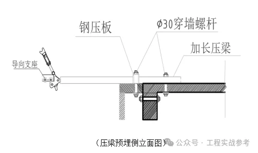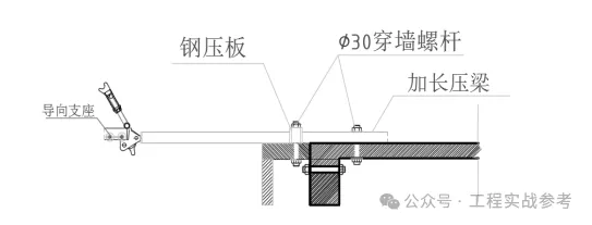 本工程从标准层开始组装全钢附着式升降脚手架,因此从标准层上一层开始预留预埋工作,标准层上一层每机位处只预留预埋附墙导向座安装孔,从标准层第二层开始每机位每层均在楼面上采用∅40PVC进行预留预埋二个孔,另一个孔视提升设备在机位导轨的一侧来预留预埋,如下图压梁预埋示意图所示: