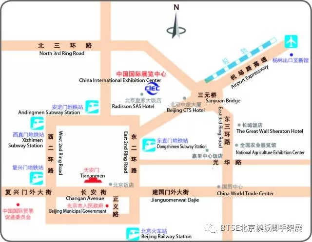 3、三元桥站(地铁10号线、机场快轨线):距展览中心约2.2公里。三元桥到展览中心的公车有300、302、300快等。
