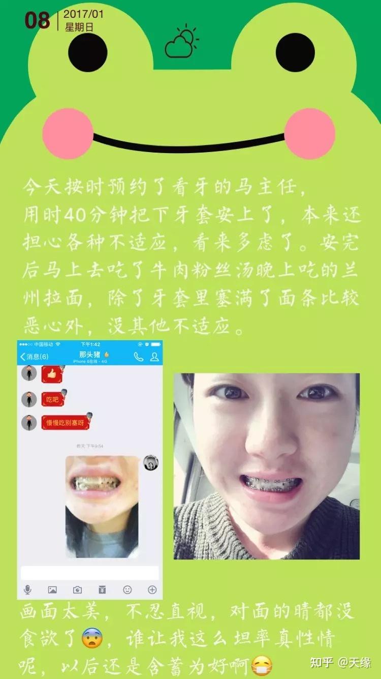 每月复诊一次,医生会稍微调整下力度等,所以调整后的一周是比较痛苦的,牙齿发酸,硬东西吃不了,合理选择饮食,要保证日常营养所需。干果类、大骨头猪蹄类等渐渐适应牙套的存在并能掌握它的受力原理后,再酌情选择,我曾经因为一颗乌梅和一颗大白兔奶糖,把托槽硌下来了,延长了治疗期也增加了成本,犹记得黏贴那颗乌梅硌下来的托槽价值90元,那颗大白兔涨到了230元。等慢慢的学会跟牙套共存亡后,你会发现,吃啥都不耽误,金刚牙的既视感。