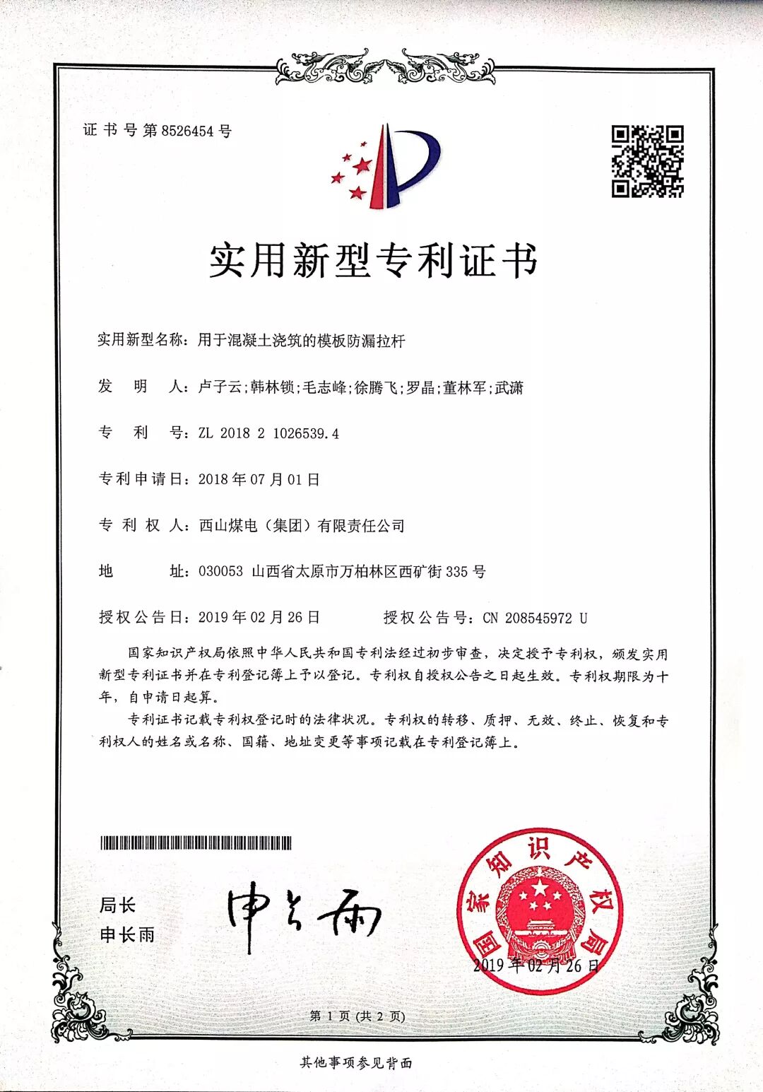 热烈祝贺我公司《用于混凝土浇筑的模板防漏拉杆》实用新型专利获得国家知识产权局授权,并于2019年2月26日获得实用新型专利证书,同时同样的发明专利正在国家知识产权局进行公布。