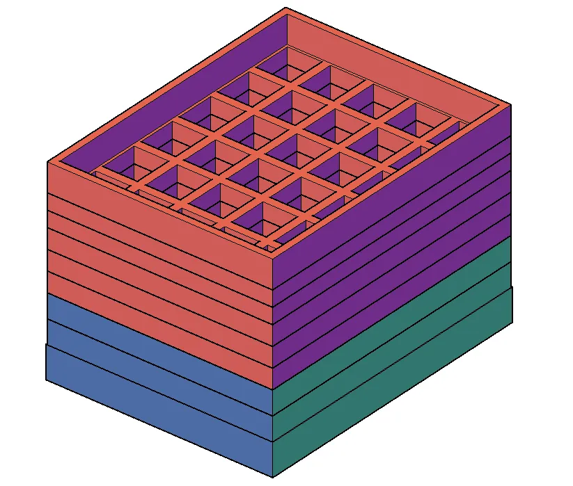 沉井第一至八节共设有30个井孔,第一节沉井井壁厚2.2m,隔墙厚1.4m;第二至八节沉井井壁厚2.3m,隔墙厚2.0m;第九节沉井中间未设有隔墙,井壁厚1.65m。