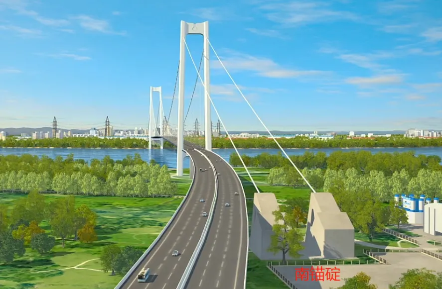 龙潭过江通道项目(即“龙潭长江大桥”)位于长江南京段与镇扬段分界处,北起仪征境内江北长江大堤,向南跨越长江,经南京龙潭,止于S338省道,线路全长4.925公里。主桥为主跨1560m钢箱梁悬索桥,按双向六车道高速公路标准建设,设计时速100公里/小时。南北塔采用群桩基础,北锚碇采用圆形地连墙基础,南锚碇采用矩形沉井基础。